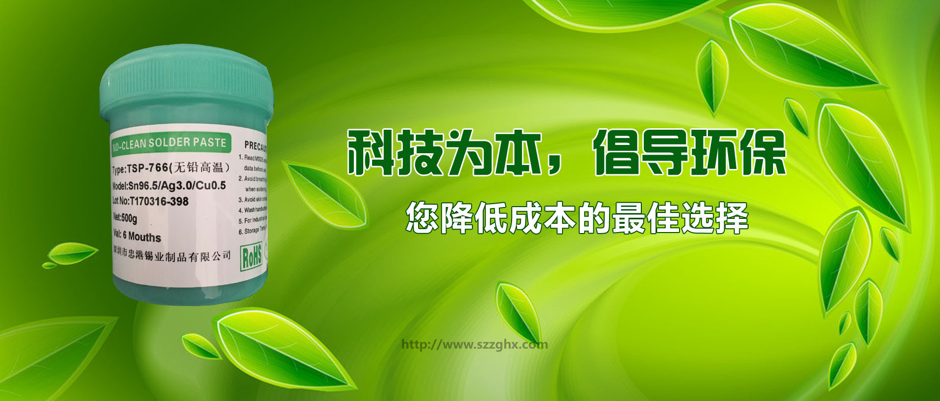 深圳市忠港錫業(yè)制品有限公司以專(zhuān)業(yè)生產(chǎn)、經(jīng)營(yíng)各種規(guī)格和用途的無(wú)鉛焊錫,環(huán)保焊錫,焊錫絲,焊錫條,焊錫線,焊錫膏,低溫錫線,焊鋁錫絲,不銹鋼焊錫絲,無(wú)鉛錫條,無(wú)鉛錫絲,無(wú)鉛錫膏, 無(wú)鉛低溫焊錫絲,無(wú)鉛免洗助焊劑,環(huán)保助焊劑,焊鋁助焊劑,焊鋁錫條,水溶性焊錫絲,不銹鋼助焊劑等為主的電子化工輔料企業(yè)。無(wú)鉛產(chǎn)品己通過(guò)SGS檢測(cè),并獲中國(guó)中輕產(chǎn)品[質(zhì)量、信譽(yù)雙保障示范單位]和國(guó)際ISO9001:2000質(zhì)量認(rèn)證。